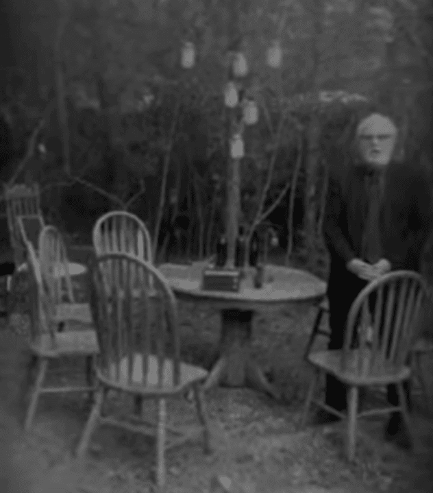 Shortly after I snapped this photo, in the midst of the séance we were facilitating, one of the sitters reported sensing the clear presence of someone or something named “Charlie.” We then began asking this purported entity questions, attempting first to get some notion of their appearance. We failed to receive any clear response to that first question and so followed up with others: “How old are you?” ” How did you pass? ” At about this time another of the participants, a man sitting at the front edge of the table no more than two feet from where I was standing, unexpectedly began convulsing. He then fell back from his chair. I rushed to help just as he collapsed to the forest floor and started crawling in a panic on all fours away from the séance table. He was groaning and gagging and spitting up something rather violently, and at first I thought he was choking or had eaten something that hadn’t agreed with him. But the gentleman, clearly in crisis, made it clear then and shortly afterwards that he had been affected by the proceedings, that he had become overcome by one of the spirits with whom we were attempting to communicate, and that this spirit had taken at least partial control of his body. During the episode it looked as if he was trying to expel something, almost as if the gentleman might start producing ectoplasm.
